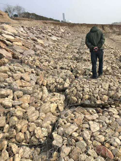 石籠網(wǎng)兜同時平均地向同層的各箱格內(nèi)投料,嚴禁將單格網(wǎng)箱一次性投滿。填充石料施工中,應(yīng)控制每層投料厚度在30cm左右,普通一米高網(wǎng)箱分四層投料為宜,并用小碎石填塞空隙。且采取妥當(dāng)?shù)膿v實措施,確保箱體填充料的密實度。石籠網(wǎng)兜填充石料頂面宜恰當(dāng)高出網(wǎng)箱上部框線。填充石料容重應(yīng)≧1.70T/M3。暴露的填充石料,外表必需用人工砌壘整平,石料間應(yīng)互相搭接。