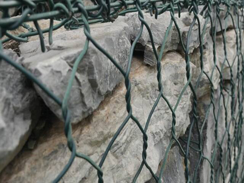綠格網(wǎng)又稱格賓網(wǎng)、石籠網(wǎng),由各種網(wǎng)孔規(guī)格的綠格網(wǎng)片按照ASTMA975-97規(guī)范組裝而成,工程現(xiàn)成填充石料組裝形成柔性的、透水的、整體的支擋結(jié)構(gòu),常用于生態(tài)防護(hù)工程。該結(jié)構(gòu)采用高熱鍍鋅鋼絲或者10%鋅鋁合金鋼絲經(jīng)過雙線絞合編織而成的,其雙線絞合部分的長度不能低于45mm,以保證絞合部分的防腐性能不被破壞。因?yàn)榄h(huán)境比較惡劣,污染比較嚴(yán)重,所以鋼絲的表面涂塑(包PVC或者PE)增強(qiáng)鋼絲的抗腐蝕性能。